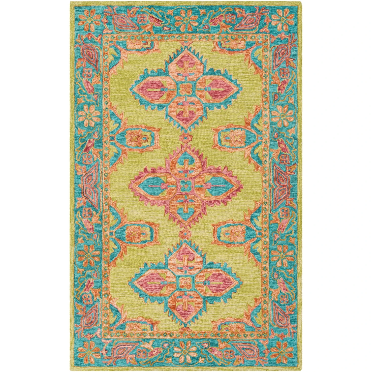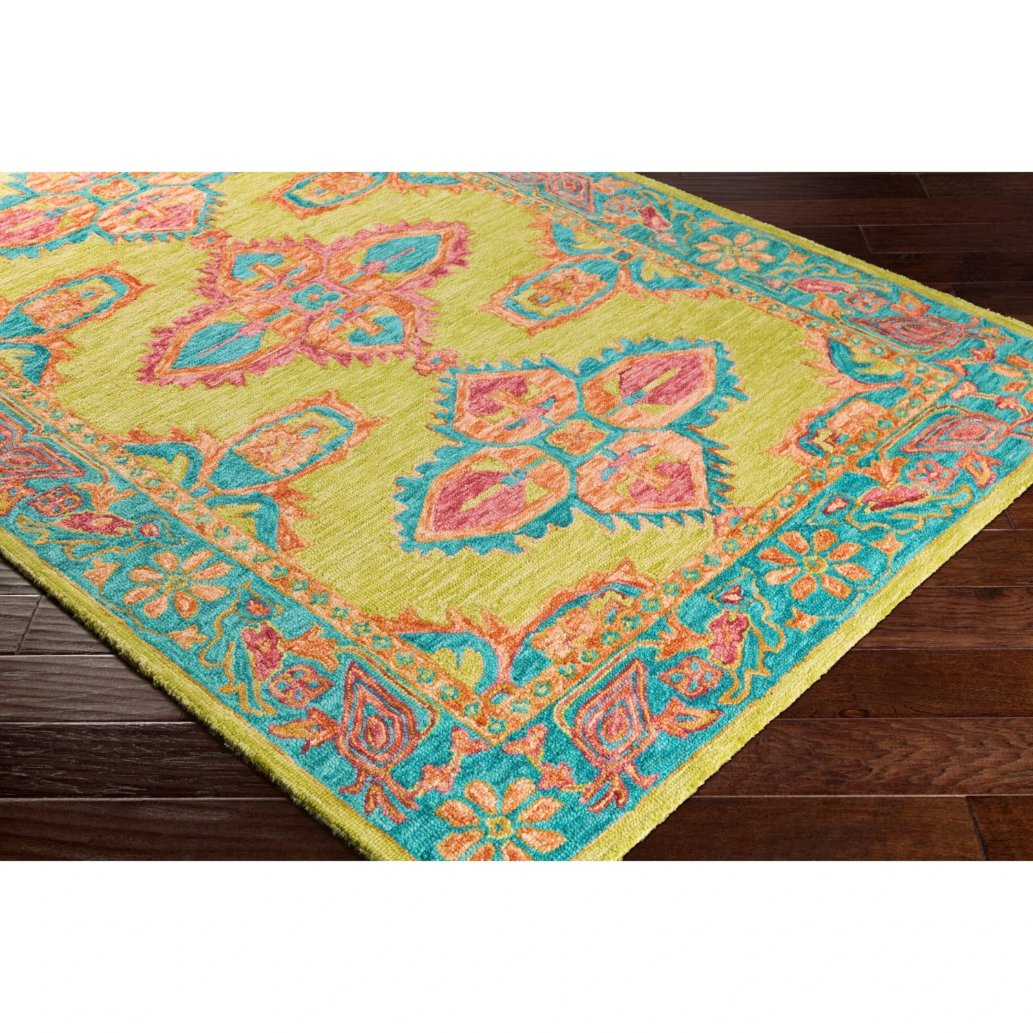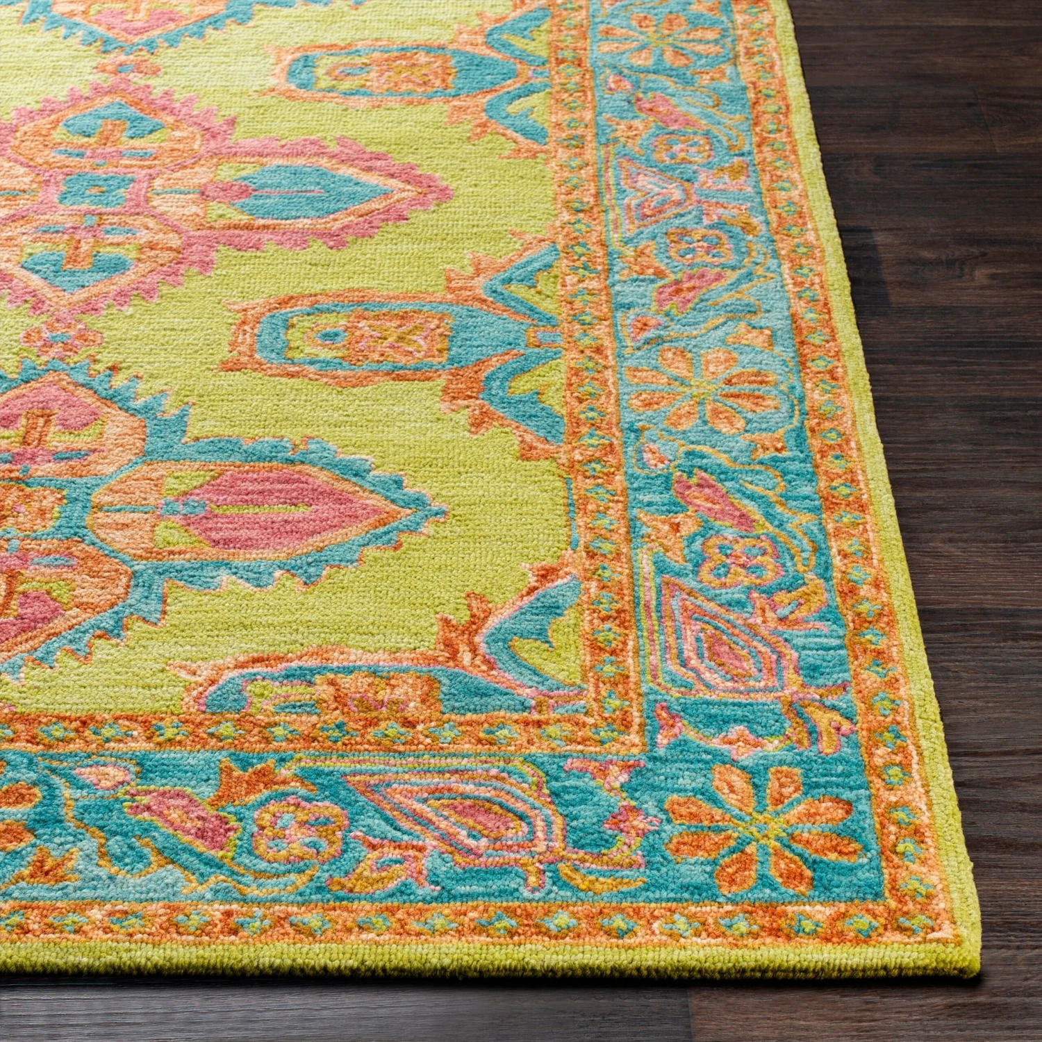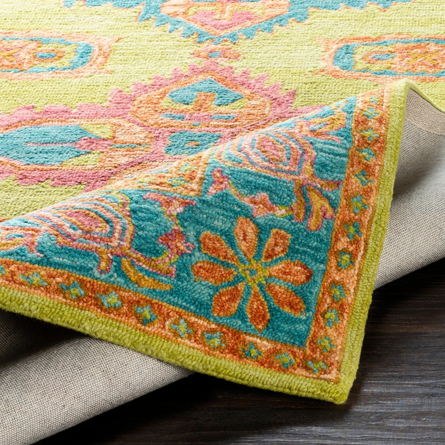 The trendy Davida collection will effortlessly bring a sense of global charm and style in your home. Hand-hooked in India, this collection showcases vibrant colors, vintage rug patterns, and a unique heathered texture. Works well in a casual or formal setting! Made with 100% wool and has a comfortable medium pile. Spot clean or professionally clean only. One Year Limited Warranty.