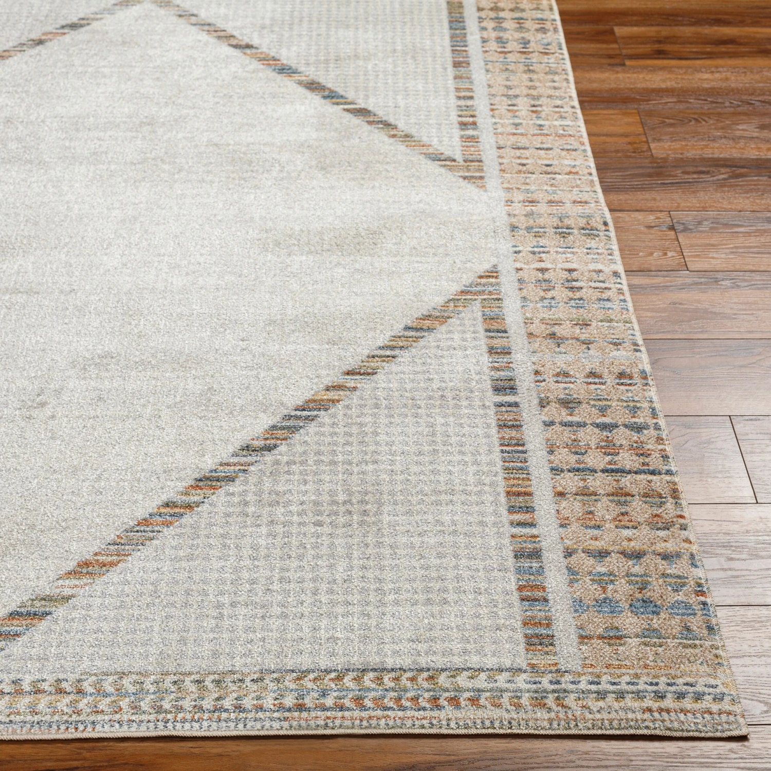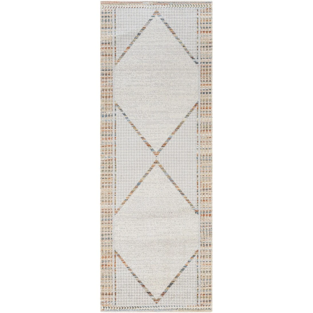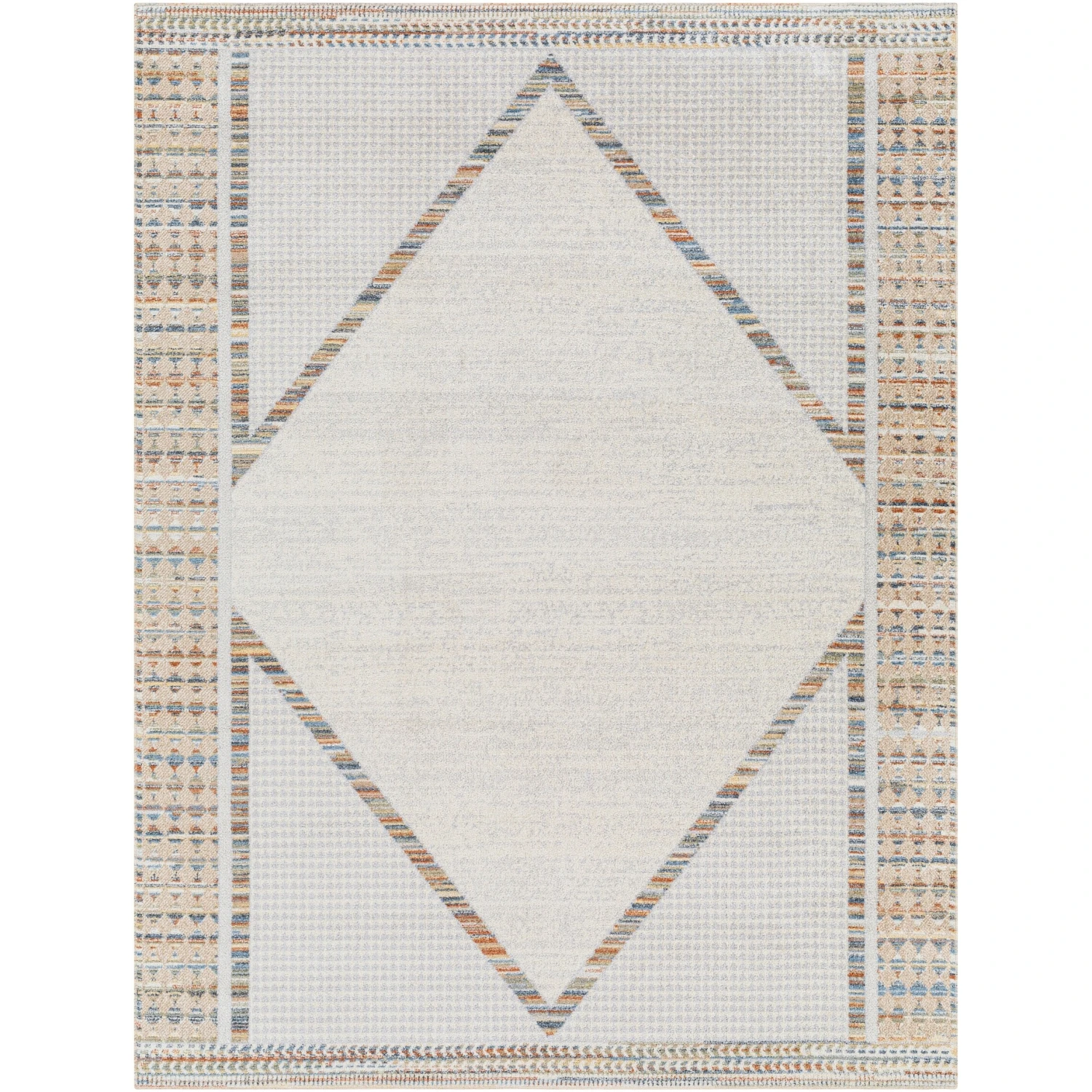 This statement rug features an oversized center diamond, multi-color diamond border, and exquisite design details woven throughout the piece. With its timeless design, this rug complements rooms furnished in a traditional, transitional, or southwestern style. This rug is woven with synthetic fibers and is machine washable, an excellent choice for high-traffic rooms, such as living rooms, hallways, and dining areas. Easy to clean and durable, this rug is perfect for homes with pets or small children. Machine wash on a cold setting without detergent and hang to dry. Spot clean with a dry, clean cloth and vacuum without a beater bar to maintain the appearance of your rug. A rug pad is recommended to prevent movement.