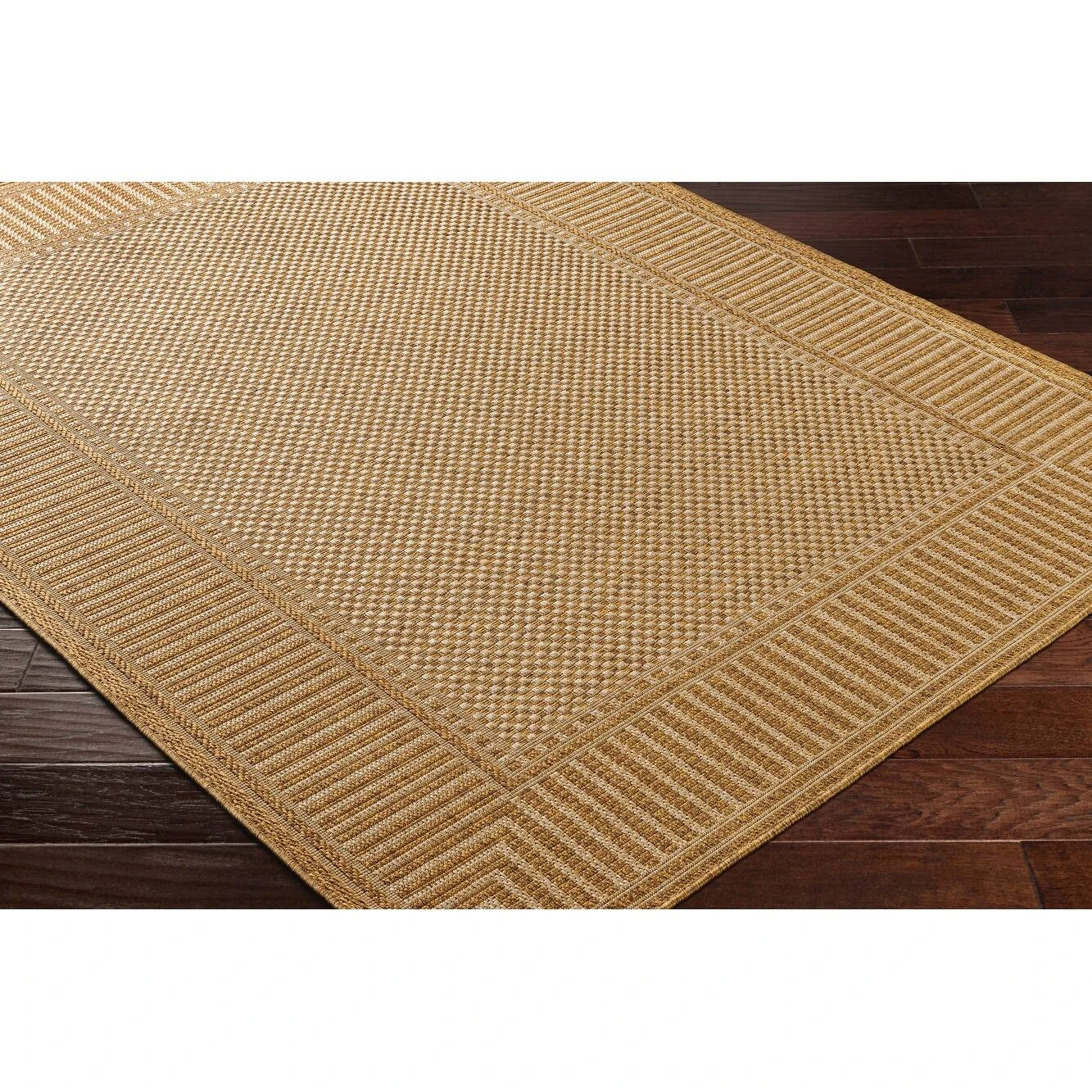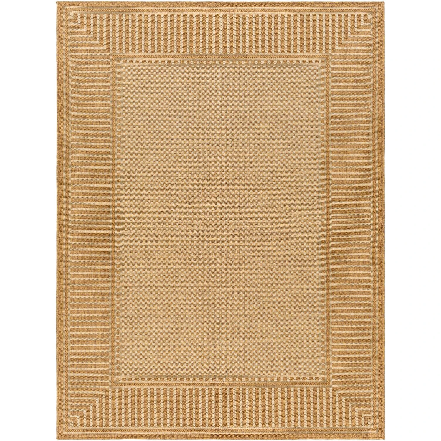 This high-performance rug from the Pismo Beach collection features a striking stripe border surrounding a checkerboard center. Place this versatile outdoor-safe accent in rooms or patios designed in a traditional, modern, global aesthetic. Machine woven in Turkey of 100% Polypropylene with no pile, this rug is suitable for high-traffic areas such as patios, entryways, hallways, dining areas, and living rooms. Easy to clean and durable, this rug is perfect for homes with small children or pets and can easily transition for use inside or outside the home. Spot clean only, or rinse with a garden hose. The use of an outdoor rug pad is recommended.