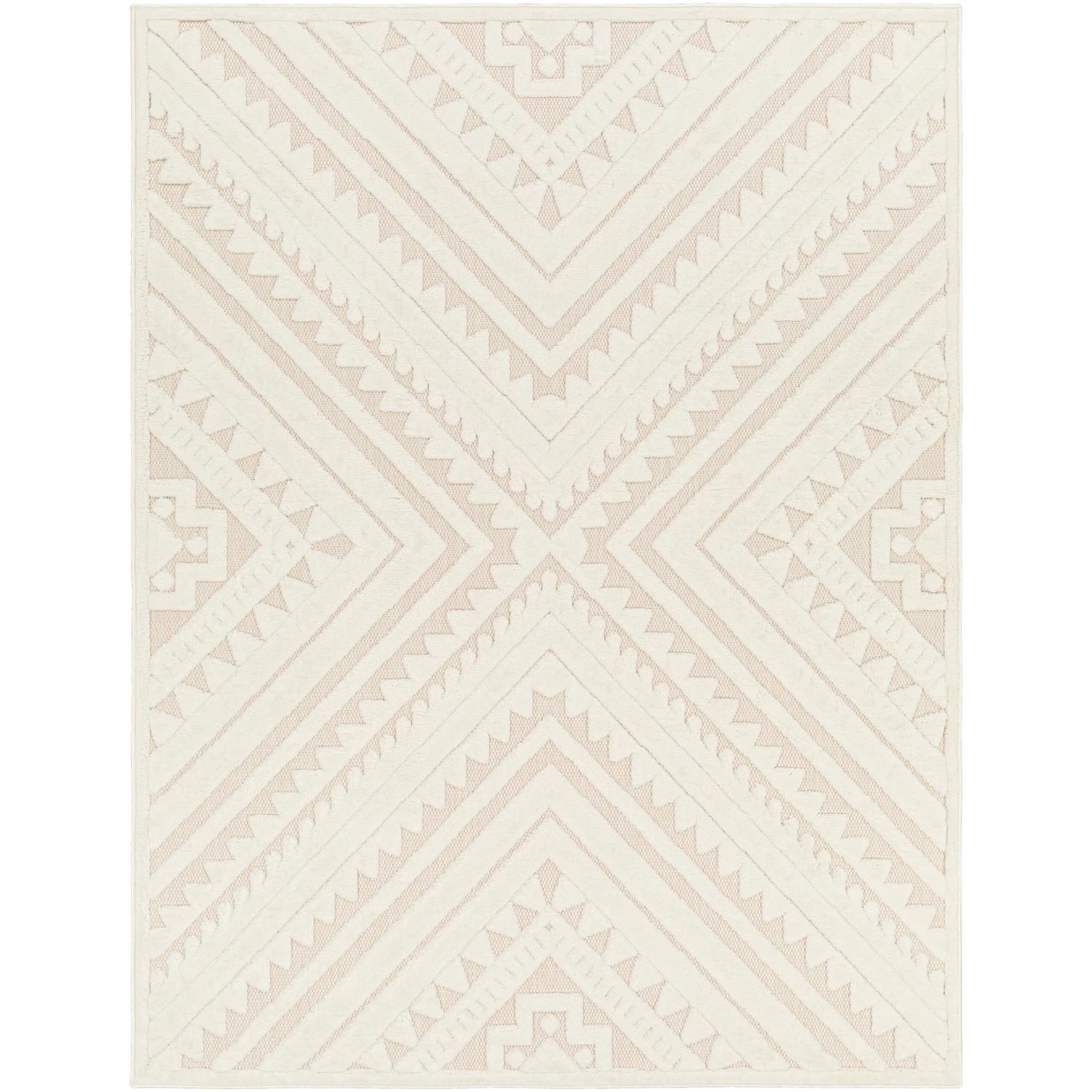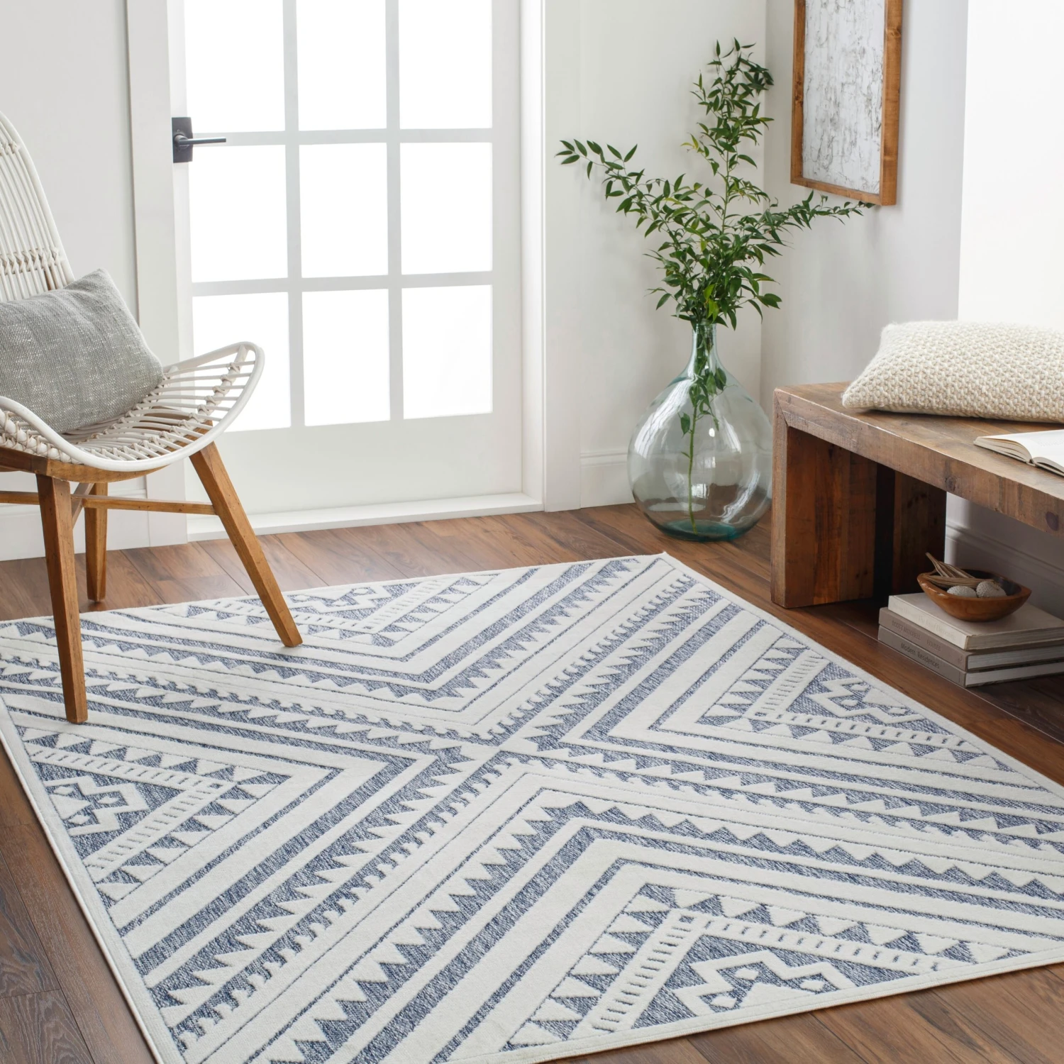 The San Diego area rug features a striking global-inspired design that endures at the forefront of contemporary trends Inverted triangles are stacked upon each other, facing all four sides, giving this rug a stylish geometric pattern Raised textures and a trendy color palette make this accent a stylish addition to transitional, bohemian, and casual spaces This outdoor rug is fade resistant and can be placed in a patio or deck Being easy to clean and durable, this rug is perfect for homes with pets or small children and can be easily transitioned for use inside the home Machine woven with Polypropylene in Turkey with a medium pile Spot clean only or rinse with a garden hose Use of an outdoor rug pad is recommended